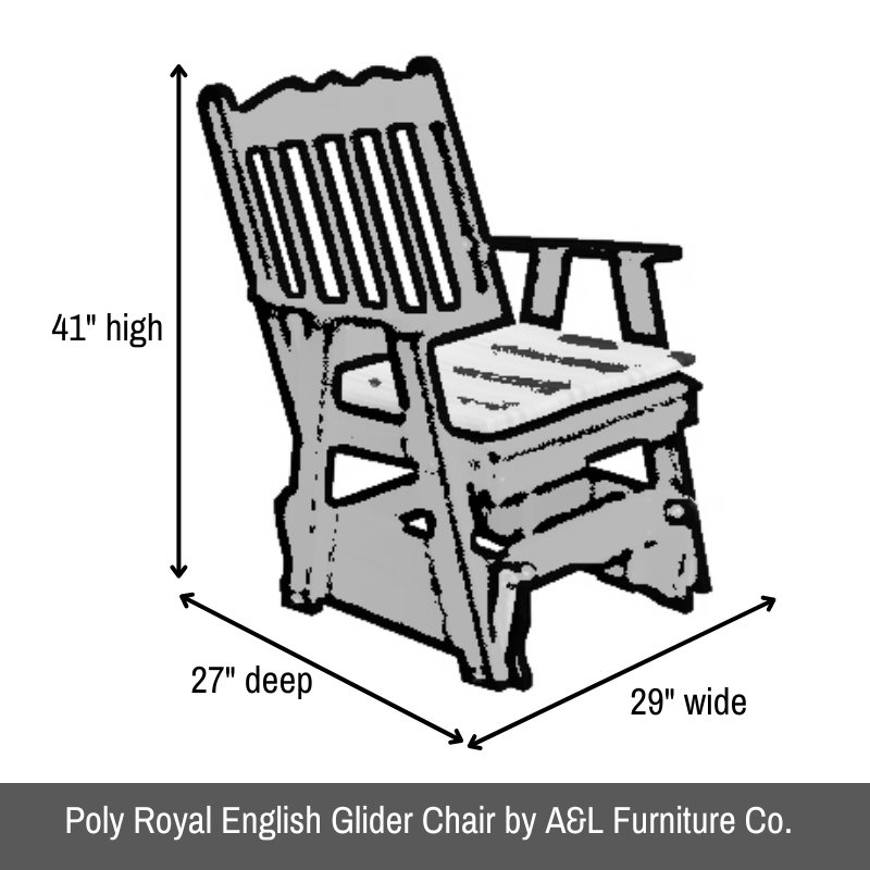 - The Poly Royal English Single Glider Chair features a contoured seat and wide armrests, providing ample space for comfortable seating. While the exact dimensions are not specified on the product page, the design is intended to accommodate individuals seeking a spacious and relaxing seating option.