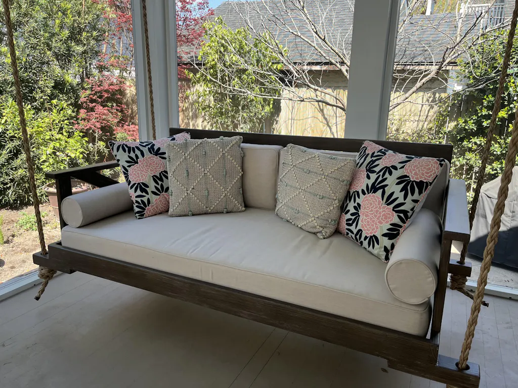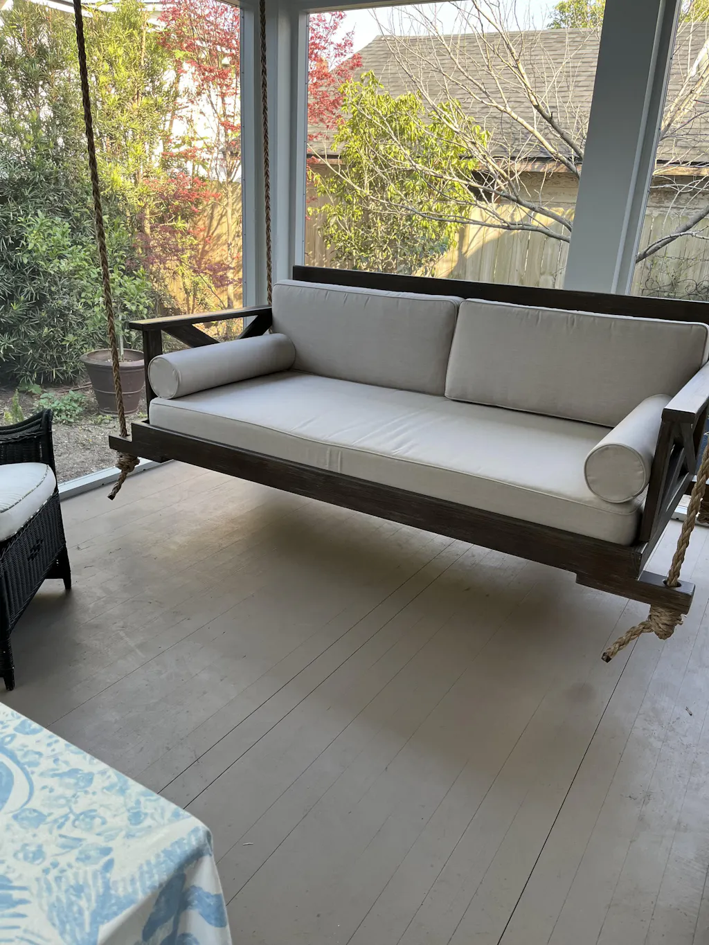 I bought this swing in a queen size to hang on my balcony overlooking the ocean. It is perfectly made and the cushions are very comfy. It is by far our favorite spot in the house now! Kristen and her team are so attentive to making every step from ordering to delivery impeccable